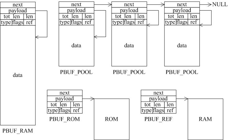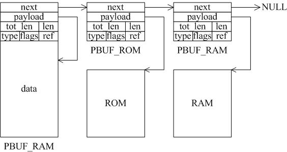 只有选择合适的pbuf类型才能发挥LWIP的最大性能,一个数据包可能是多种pbuf的组合,用链表连接起来,如图3所示。