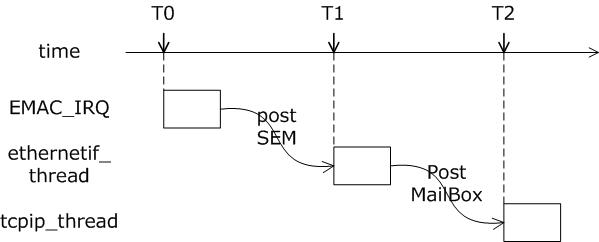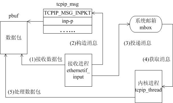 当以太网口接收到一个数据包后,EMAC_IRQ中断服务程序通过信号量通知ethernetif线程,ethernetif线程调用low_level_input()接收该数据包并通过邮箱交付给tcpip_thread线程,tcpip_thread根据该数据包的类型进行相应处理。它是建立在消息传递的基础上的,如图8所示。