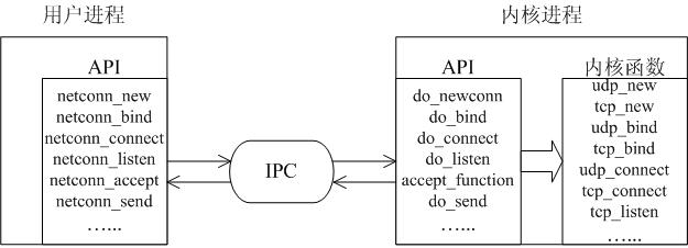 API设计的核心在于让用户进程负责尽可能多的工作,例如数据的计算、拷贝等;而协议栈进程只负责简单的通信工作,这是很合理的,因为系统可能存在多个应用程序,它们都使用协议栈进程提供的通信服务,保证内核进程的高效性和实时性是提高系统性能的重要保障。进程之间通信使用IPC技术,包括邮箱、信号量和共享内存,如图9所示。