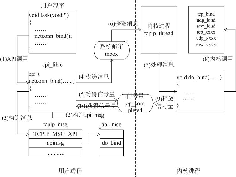 以函数netconn_bind()为例看API是如何实现的,首先用户程序中调用函数netconn_bind()绑定一个连接,则这个函数实现时,是通过向内核进程发送一个TCPIP_MSG_API类型的消息,告诉内核进程执行do_bind函数:在消息发送后,函数阻塞在信号量上,等待内核处理该消息;内核在处理消息时,会根据消息内容调用do_bind,而do_bind会根据连接的类型调用内核函数udp_bind、tcp_bind或raw_bind;当do_bind执行完后,它会释放信号量,这使被阻塞的netconn_bind得以继续执行,整个过程如图10所示。