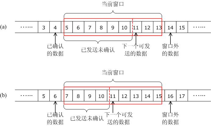 由于实际数据发送时是按照报文段的形式组织的,因此可能存在这样的情况:即使发送窗口允许,但并不是窗口内的所有数据都能发送以填满窗口,如图13中编号为11~13的数据,可能因为它们太小不能组织成一个有效的报文段,因此不会被发送。发送方会等到新的确认到来,从而使发送窗口向右滑动,使得更多的数据被包含在窗口中,这样再启动下一个报文段的发送。