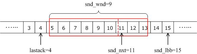 发送窗口中,lastack记录了被接收方确认的最高序列号,snd_nxt表示自己将要发送的下一个数据的起始编号,snd_wnd记录了当前的发送窗口大小,它常被设置为接收方通告的接收窗口值,snd_lbb记录了下一个被应用程序缓存的数据的起始编号,如图10所示。