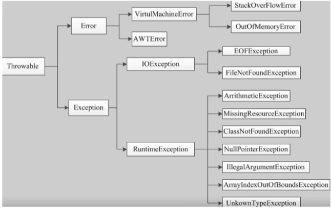- 错误ERROR:错误不是异常,而是脱离程序员控制的问题。错误在代码中通常被忽略。例如,当栈溢出时,一个错误就发生了,它们在编译也检查不到的。