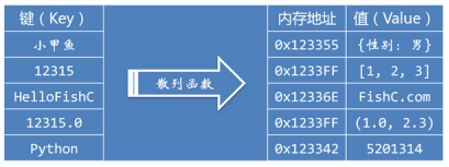 另外还需要注意的一点是,Python 的哈希算法对相同的值计算得到的结果是一样的,也就是说 12315 和 12315.0 的值相同,他们被认为是相同的键(Key)。