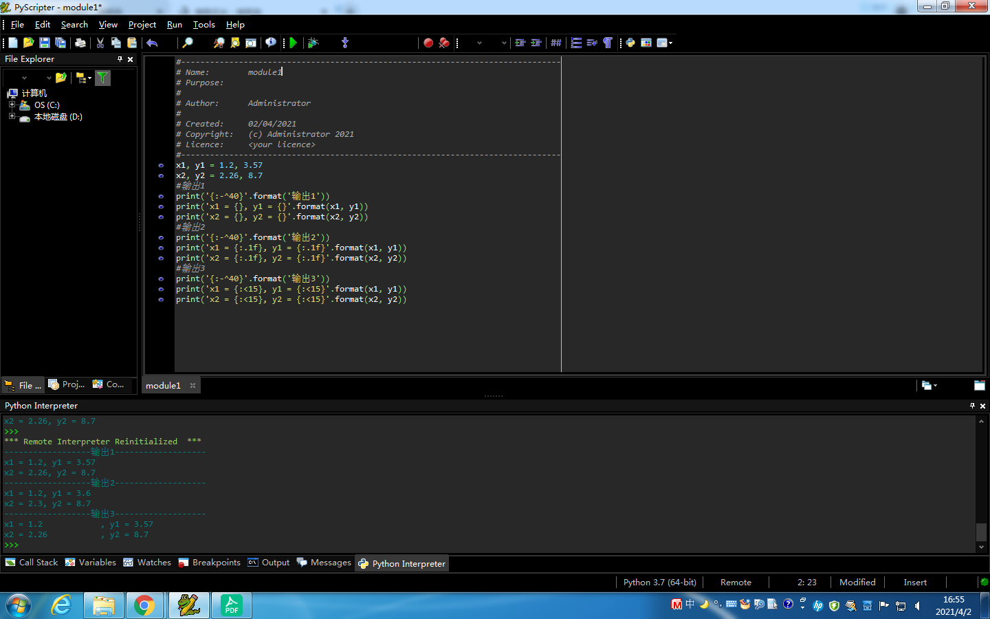 x1, y1 = 1.2, 3.57 x2, y2 = 2.26, 8.7 #输出1 print('{:-^40}'.format('输出1')) print('x1 = {}, y1 = {}'.format(x1, y1)) print('x2 = {}, y2 = {}'.format(x2, y2)) #输出2 print('{:-^40}'.format('输出2')) print('x1 = {:.1f}, y1 = {:.1f}'.format(x1, y1)) print('x2 = {:.1f}, y2 = {:.1f}'.format(x2, y2)) #输出3 print('{:-^40}'.format('输出3')) print('x1 = {:<15}, y1 = {:<15}'.format(x1, y1)) print('x2 = {:<15}, y2 = {:<15}'.format(x2, y2))