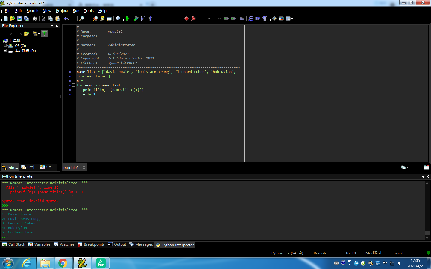 name_list = ['david bowie', 'louis armstrong', 'leonard cohen', 'bob dylan', 'cocteau twins'] n = 1 for name in name_list: print(f'{n}: {name.title()}') n += 1