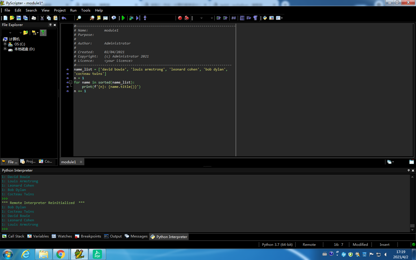 name_list = ['david bowie', 'louis armstrong', 'leonard cohen', 'bob dylan', 'cocteau twins'] n = 1 for name in sorted(name_list): print(f'{n}: {name.title()}') n += 1