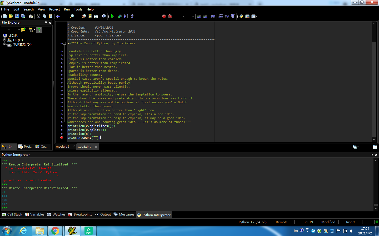 x="""The Zen of Python, by Tim Peters Beautiful is better than ugly. Explicit is better than implicit. Simple is better than complex. Complex is better than complicated. Flat is better than nested. Sparse is better than dense. Readability counts. Special cases aren't special enough to break the rules. Although practicality beats purity. Errors should never pass silently. Unless explicitly silenced. In the face of ambiguity, refuse the temptation to guess. There should be one-- and preferably only one --obvious way to do it. Although that way may not be obvious at first unless you're Dutch. Now is better than never. Although never is often better than *right* now. If the implementation is hard to explain, it's a bad idea. If the implementation is easy to explain, it may be a good idea. Namespaces are one honking great idea -- let's do more of those!""" print(len(x.splitlines())) print(len(x.split())) print(len(x)) print(x.count(""))