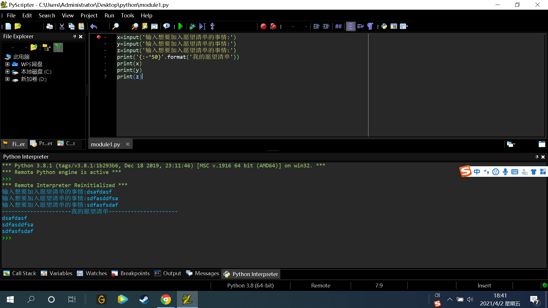 x=input('输入想要加入愿望清单的事情:') y=input('输入想要加入愿望清单的事情:') z=input('输入想要加入愿望清单的事情:') print('{:-^50}'.format('我的愿望清单')) print(x) print(y) print(z)