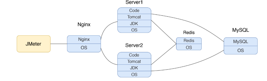那么我们就来到开始的位置了。做性能监控之前,先画一个最简单的架构图,看一下架构中各有什么组件,各有什么服务,将这些列下来,再找对应的监控手段和方式,看哪种手段和方式在性能测试过程中成本最低,效率最高。