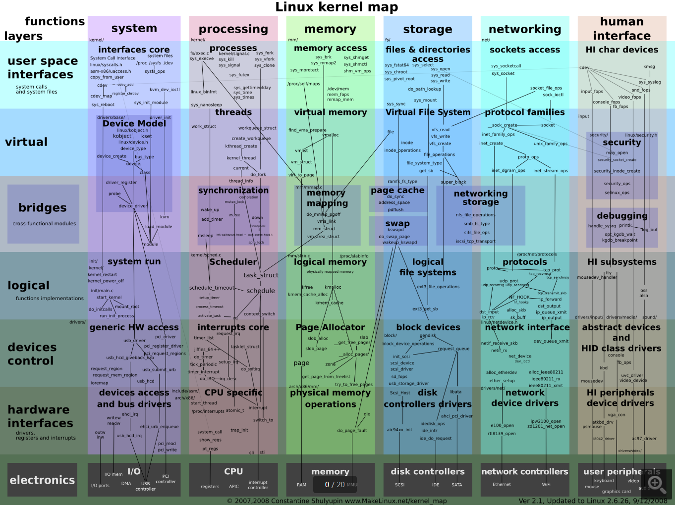 因为新版内核没有给更细的内核架构图,所以我用2.6.26版本的Linux内核架构图来说明思路。