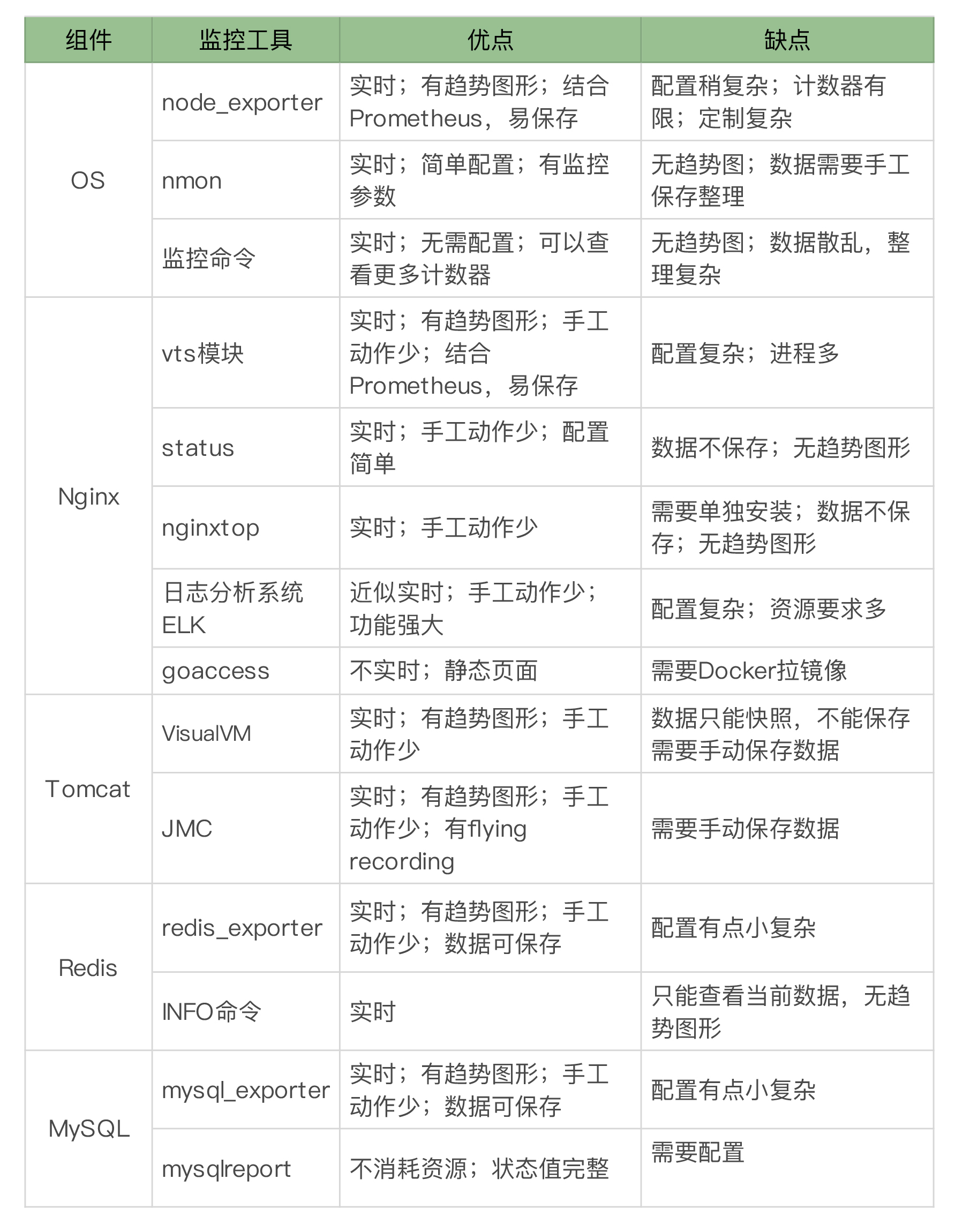 针对上面我们画的架构图,我大概列出相应的监控工具及优缺点。这里列得并不详尽,只供借鉴思路使用。