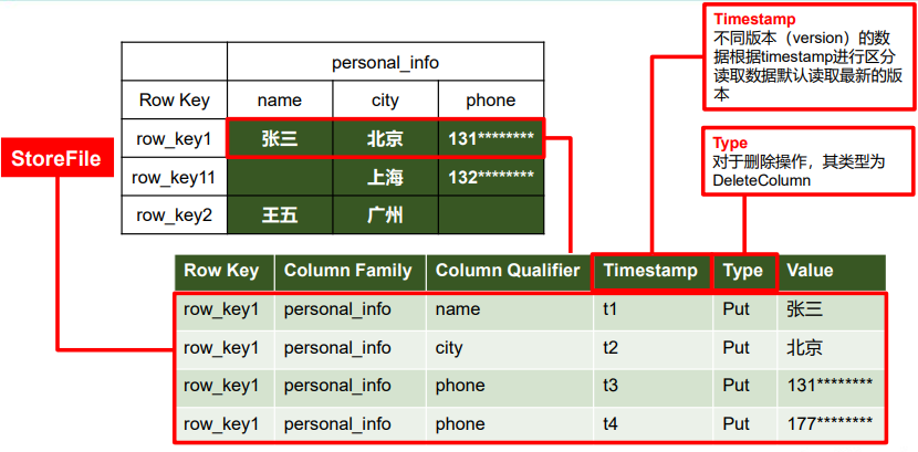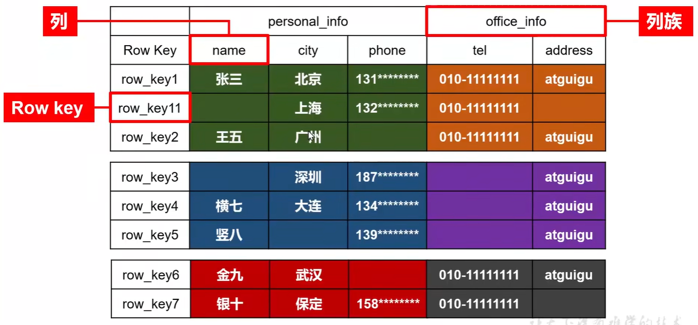 不同的是,HBase 定义表时只需要 声明列族 即可,不需要声明具体的列。因为数据存储时稀疏的,所有往 HBase 写入数据时,字段可以 动态、按需 指定。因此,和关系型数据库相比,HBase 能够轻松应对字段变更的场景