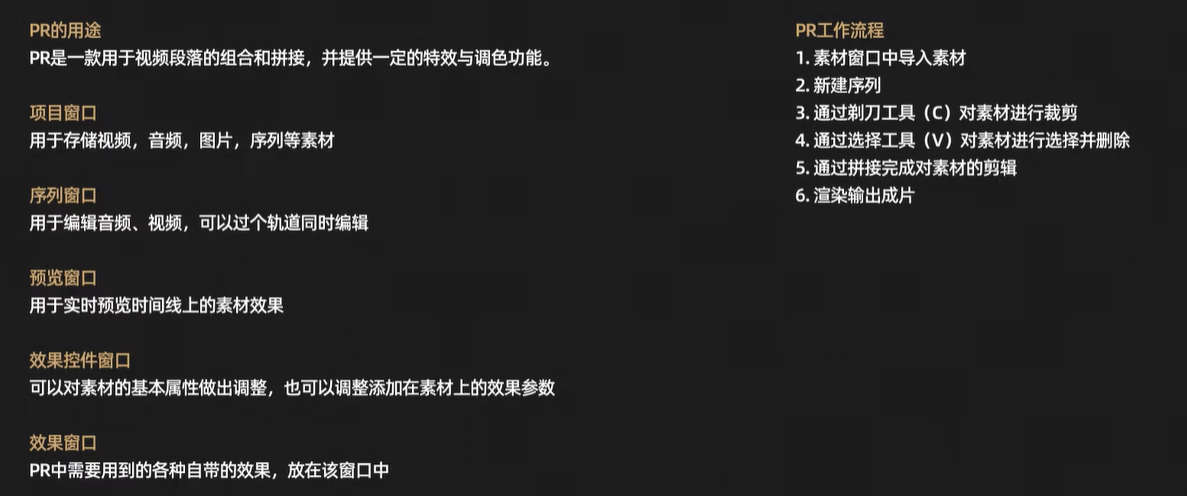 视频制作:前期策划 - 中期拍摄 - 后期剪辑(粗剪-精剪-调色-特效-音频:分别对应Pr的菜单栏)