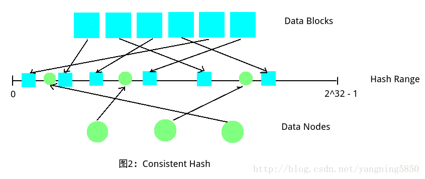 如下图如果选取的哈希函数取值范围在0到2^32 - 1之间(Hash Range),那么我们可以同时把Data Blocks和Data Nodes同时哈希到这个范围里面,这些Nodes会把Hash Range划分为若干区域,规定每个Node存储与其相邻的前一个区域中的Blocks,从而完成数据的分配。这种方式的好处在于,即使出现Data Nodes数量变化的情况,也不会影响其它Nodes和Blocls的位置情况,最多是在被删除节点或者新增节点的附近进行调整,比如将原有区域中的Blocks进一步划分或者合并。