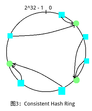 上图展示的方式中,三个Nodes将Hash Range分为了4个区域,显然不方便分配,所以提出一致性哈希环的概念,即将Hash Range的首位相连,然后在一个环路上面进行划分,N个Nodes一定能够划分出N个区域,然后让每个Node存储前一个相邻区域即可。如下图所示: