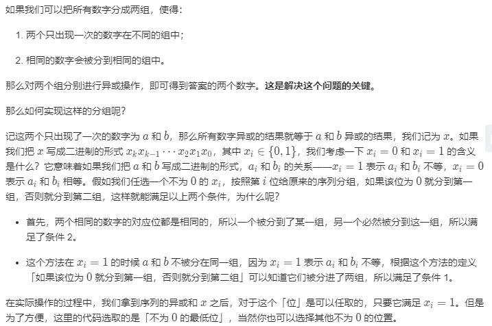 class Solution { public int[] singleNumbers(int[] nums) { int res=0; for(int i:nums){ res^=i; } int h=1; while((h&res)==0){ h<<=1; } int a=0,b=0; for(int i:nums){ if((h&i)==0){ a^=i; }else{ b^=i; } } return new int[]{a,b}; } }