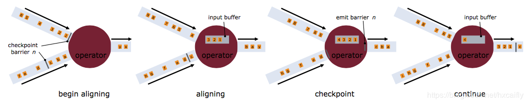1、checkpoint:Checkpoint指定触发生成时间间隔后,每当需要触发Checkpoint时,会向Flink程序运行时的多个分布式的Stream Source中插入一个Barrier标记,这些Barrier会根据Stream中的数据记录一起流向下游的各个Operator。当一个Operator接收到一个Barrier时,它会暂停处理Steam中新接收到的数据记录。因为一个Operator可能存在多个输入的Stream,而每个Stream中都会存在对应的Barrier,该Operator要等到所有的输入Stream中的Barrier都到达。当所有Stream中的Barrier都已经到达该Operator,这时所有的Barrier在时间上看来是同一个时刻点(表示已经对齐),在等待所有Barrier到达的过程中,Operator的Buffer中可能已经缓存了一些比Barrier早到达Operator的数据记录(Outgoing Records),这时该Operator会将数据记录(Outgoing Records)发射(Emit)出去,作为下游Operator的输入,最后将Barrier对应Snapshot发射(Emit)出去作为此次Checkpoint的结果数据。