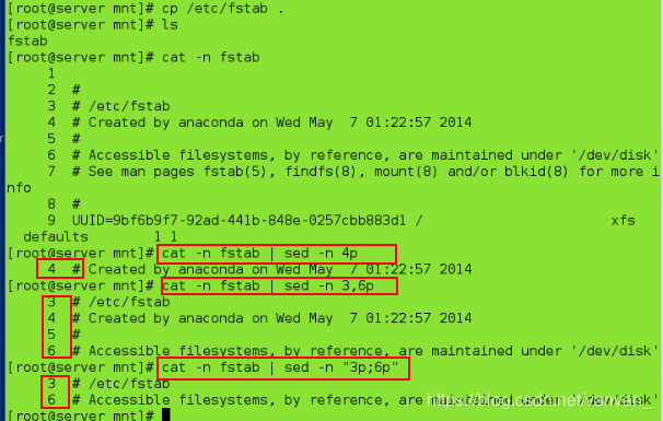 cat fstab -n | sed -n 3,6p ##显示3-5行内容
