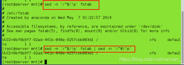 sed -n '/^$/!p' fstab | sed -n '/^#/!p' ##不显示空白行和#所在行