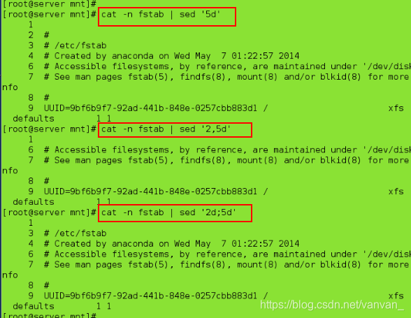 cat -n fstab | sed '5d' ##删除第五行