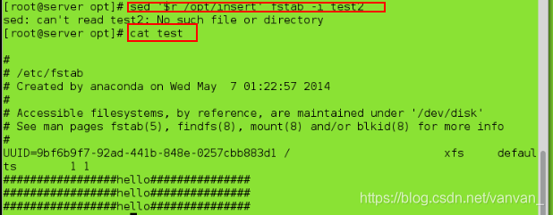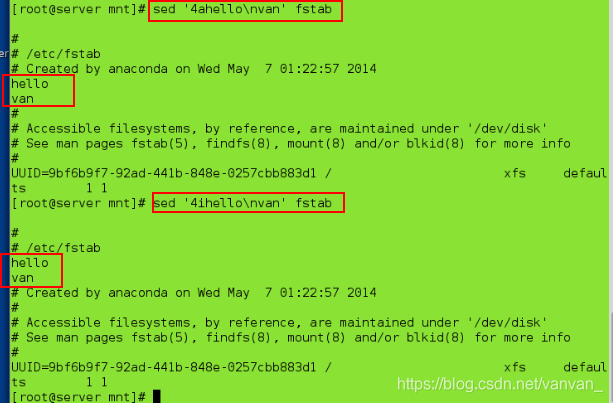 sed '4ihello\nvan' fstab ##在第四行插入