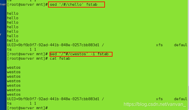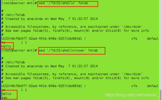 sed '/^UUID/ahello\nvan' fstab ##在UUID下一行添加两行