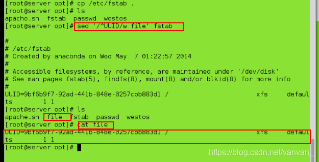 sed '/^UUID/w file' fstab ##将UUID所在行,导入file文件,该文件可以不存在