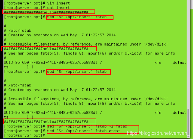 sed '$r/opt/insert' fstab > test ## 保存修改到test文件中