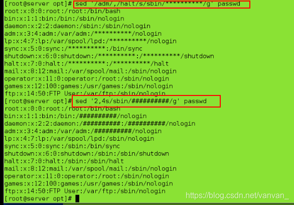 sed '/adm/,/halt/s/sbin/********/g' passwd ##将adm到halt行中的sbin替换成*******