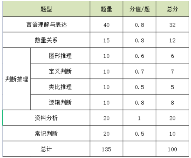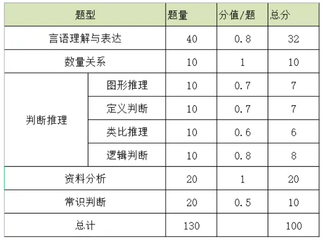国考考试科目分为《行政能力测验》和《申论》两科,分为省级和地级两类试卷,各试卷满分都为100分,其中行测省级试卷比地级试卷多5道题,言语题量相同但题型分布略有区别。