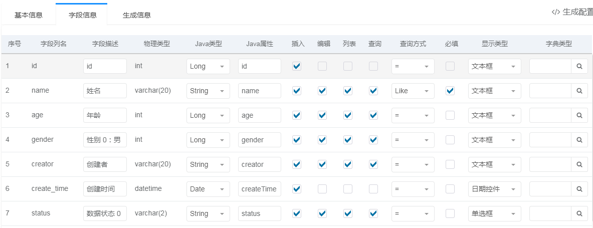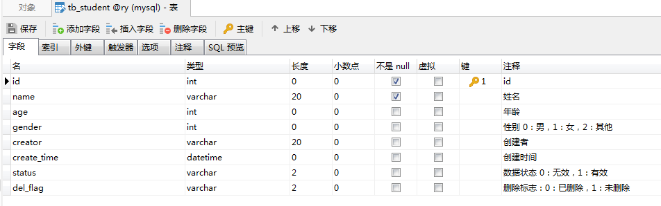 2、在mysql打开数据库ry,新建表学生表tb_student,表结构如下