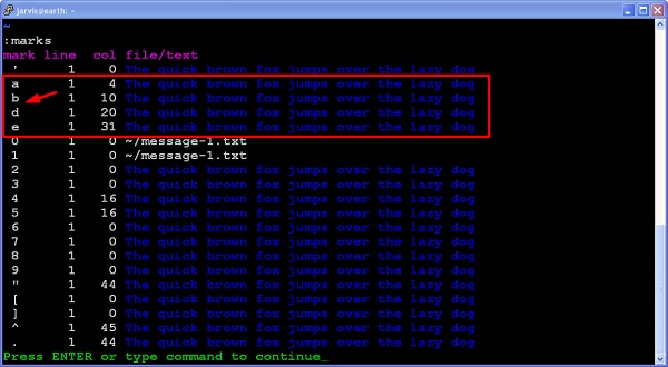 在上面的示例中,书签名称是单个字母字符。例如,下面的命令创建名称a的书签。
