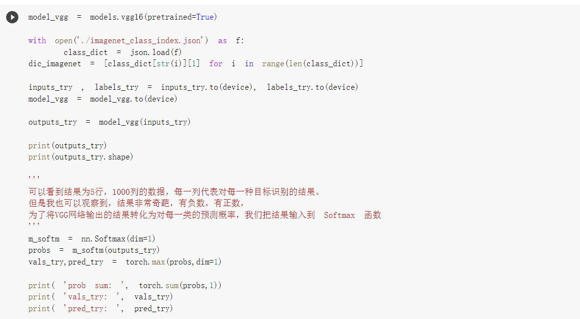 在本课程中,我们直接使用预训练好的 VGG 模型。同时,为了展示 VGG 模型对本数据的预测结果,还下载了 ImageNet 1000 个类的 JSON 文件。
