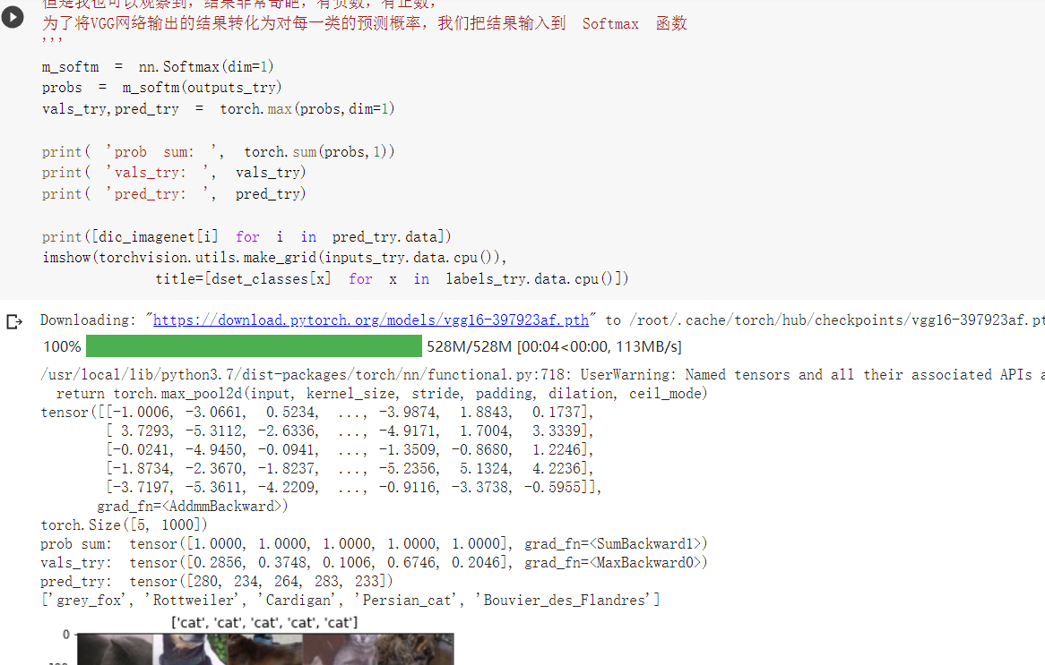 在这部分代码中,对输入的5个图片利用VGG模型进行预测,同时,使用softmax对结果进行处理,随后展示了识别结果。可以看到,识别结果是比较非常准确的。