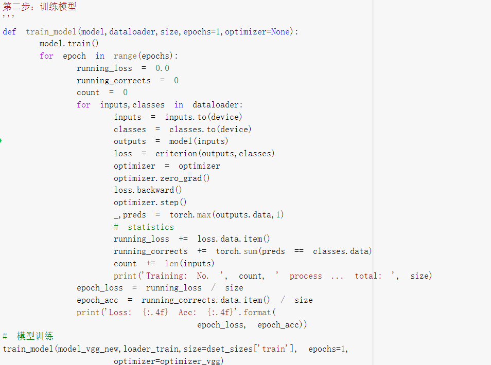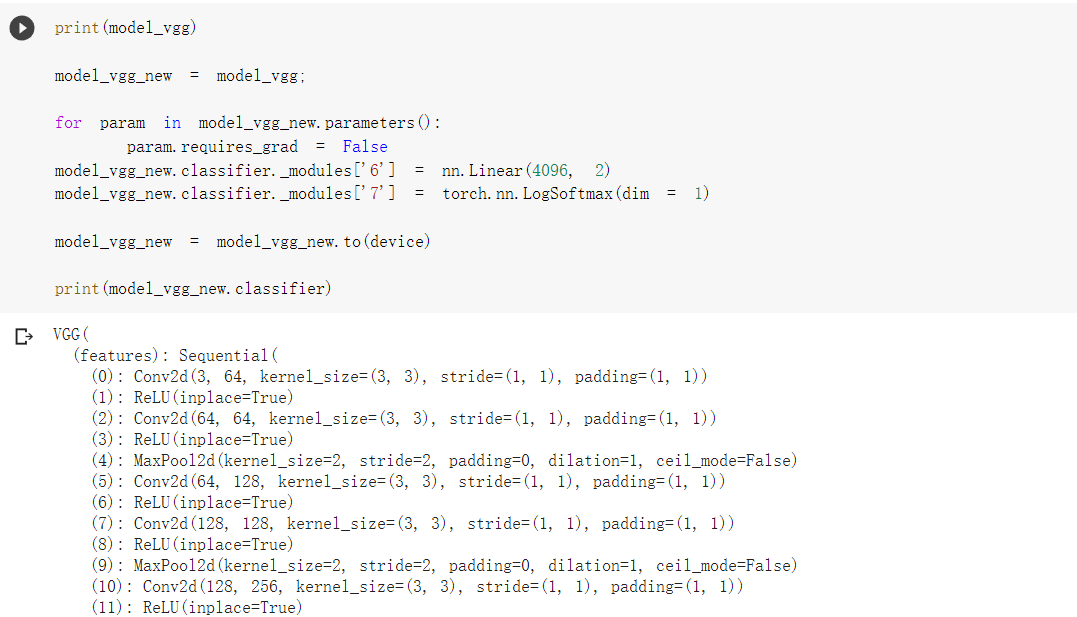 我们的目标是使用预训练好的模型,因此,需要把最后的 nn.Linear 层由1000类,替换为2类。为了在训练中冻结前面层的参数,需要设置 required_grad=False。这样,反向传播训练梯度时,前面层的权重就不会自动更新了。训练中,只会更新最后一层的参数。