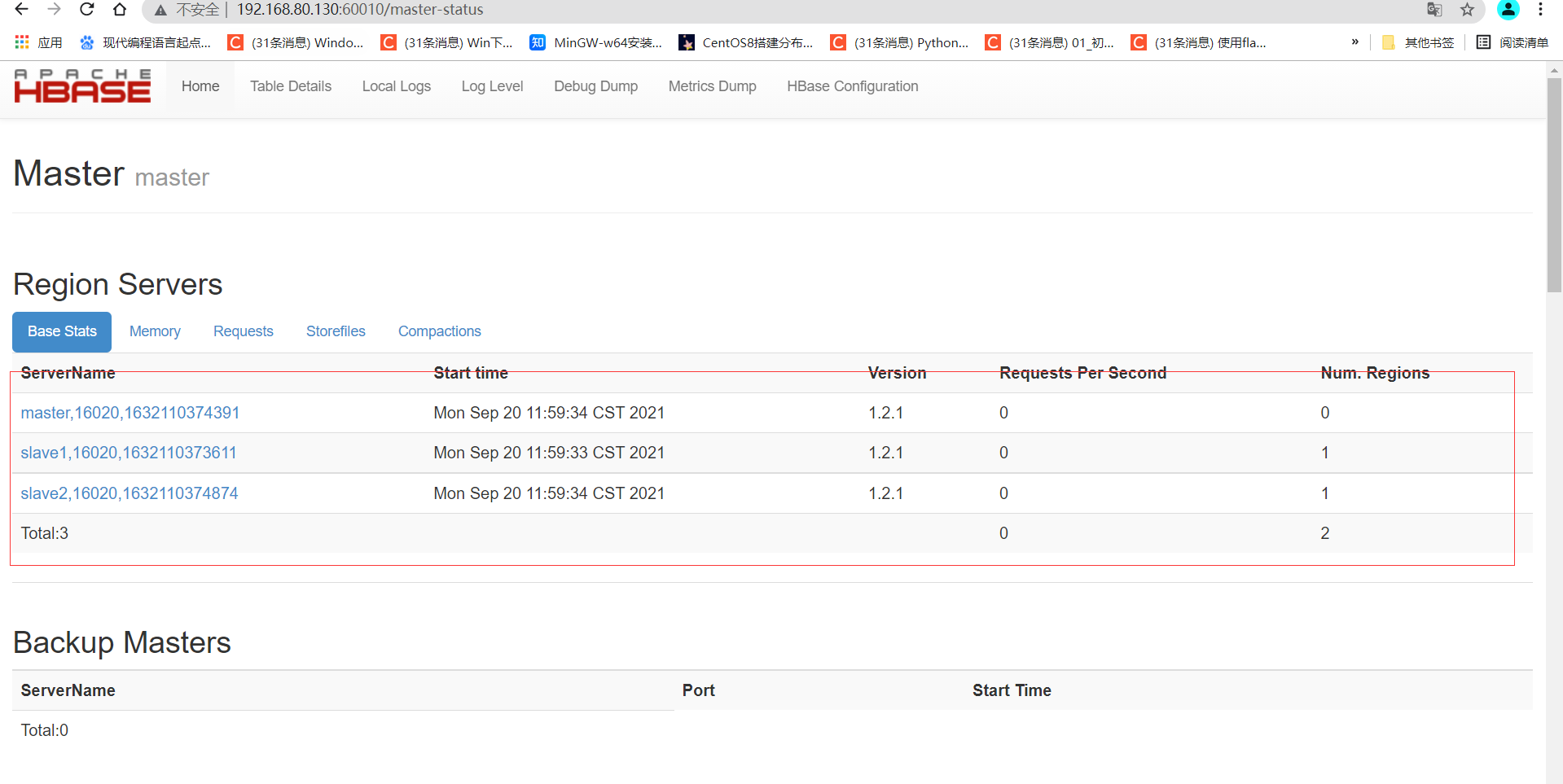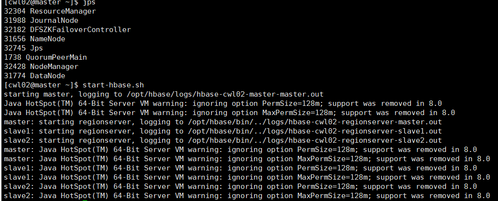 master节点中启动Hmaster,slave1和slave2中启动HRegionserver