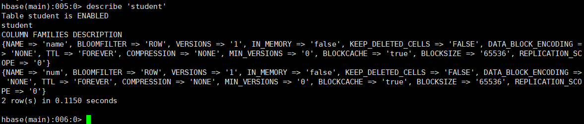 ③:查看建表的详细信息 describe 'student'