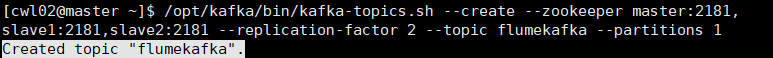 /opt/kafka/bin/kafka-topics.sh --create --zookeeper master:2181,slave1:2181,slave2:2181 --replication-factor 2 --topic flumekafka --partitions 1