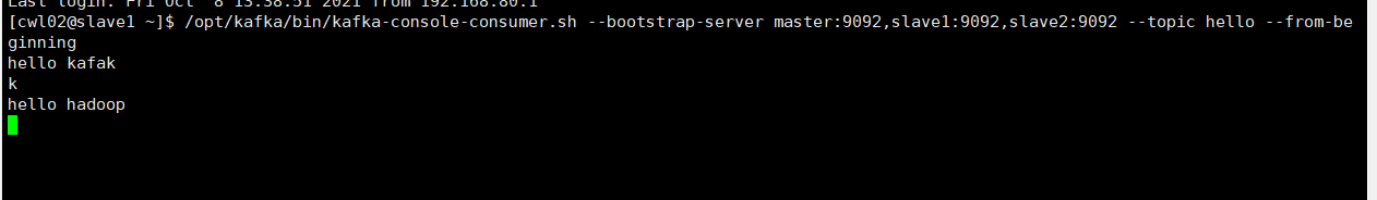 /opt/kafka/bin/kafka-console-consumer.sh --bootstrap-server master:9092,slave1:9092,slave2:9092 --topic flumekafka --from-beginning