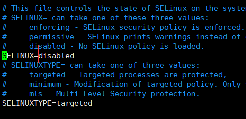 将 SELINUX=enforcing 改为 SELINUX=disabled
