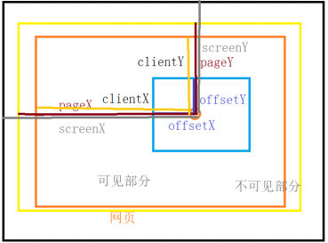 e.x e.y //对应鼠标到最顶部的距离(不包含不可见距离) 不常用