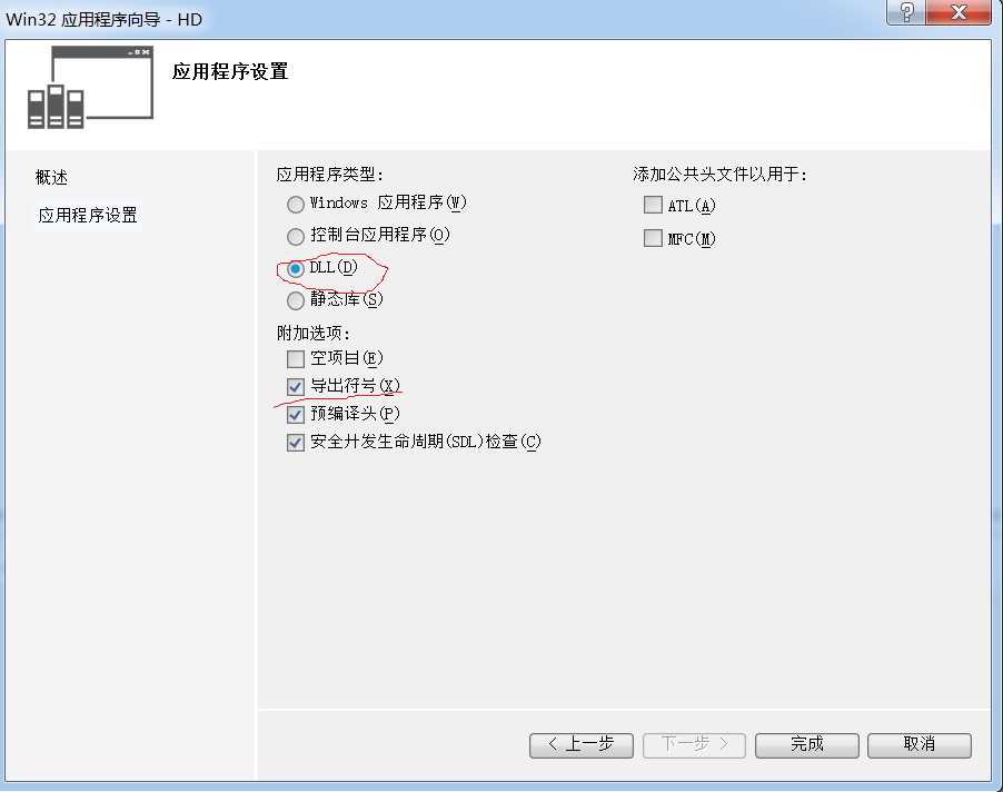 向导的应用程序类型选择:DLL,勾选“导出符号”。