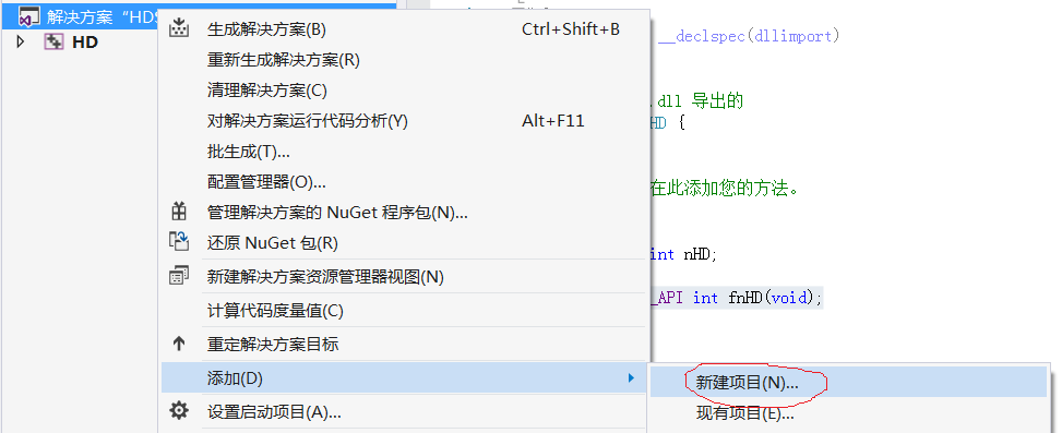 三,解决方案上鼠标右键,在菜单中选择“增加新项目”。