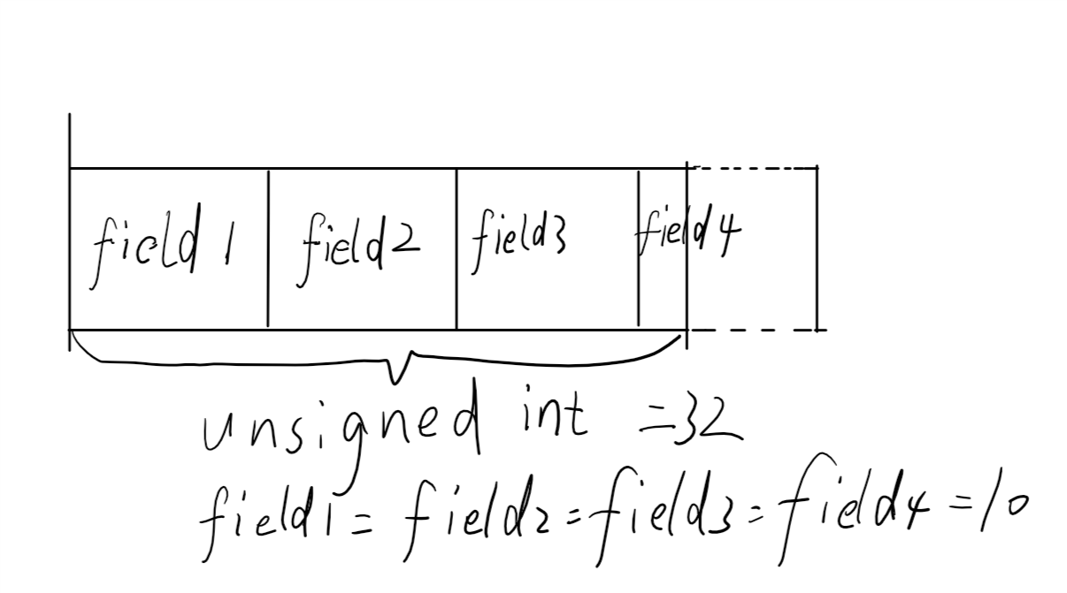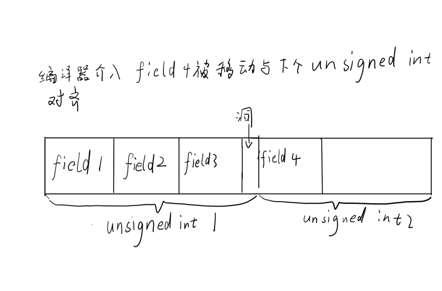 位字段肯定是小于一个unsigned int的,所以这里指的跨越边界应该是多个位字段排列下去导致某个位字段跨越了unsigned int的边界,假设在一个系统中unsigned int为32位,则会出现这种情况