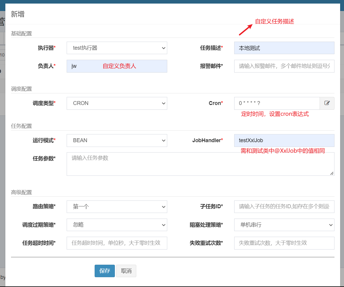 xxl: job: admin: # 调度中心部署跟地址 [选填]:如调度中心集群部署存在多个地址则用逗号分隔。 addresses: http://127.0.0.1:8080/xxl-job-admin # 执行器通讯TOKEN [选填]:非空时启用 accessToken: "" executor: # 执行器的应用名称 appname: xxl-job-test # 执行器注册 [选填]:优先使用该配置作为注册地址 address: "" # 执行器IP [选填]:默认为空表示自动获取IP ip: "" # 执行器端口号 [选填]:小于等于0则自动获取;默认端口为9999 port: 9999 # 执行器运行日志文件存储磁盘路径 [选填] :需要对该路径拥有读写权限;为空则使用默认路径; logpath: /data/applogs/xxl-job/jobhandler # 执行器日志文件保存天数 [选填] : 过期日志自动清理, 限制值大于等于3时生效; 否则, 如-1, 关闭自动清理功能; logretentiondays: -1注:如果将配置在ncaos中进行配置,需将xxl.job.accessToken等默认为空的配置赋予空字符串"",否则会报Could not resolve placeholder ‘xxl.job.accessToken’ in value “${xxl.job.accessToken}”错误(在本地配置文件中配置则不需要)