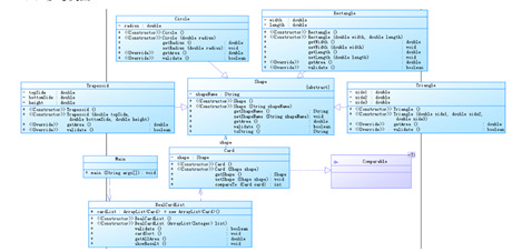 1. 对于题目集7-1来说,这次的操作主要还是对类的继承以及多态的使用和接口的应用。通过对设计好的类进行操作,在难度方面还是有很大的降低了。我们需要正确的理解类与类之间的关系便可以很好的将这次的作业完成了。这次实际上就是对图形进行分类和计算出各个图形的面积并进行排序。设计上来说,主要就是设计了几个类,包括DealCardList类,Card类,Shape类,Circle类,Rectangle类,Triangle类,Trapezoid类,通过对这几个类进行操作,即可将输入的数据进行正确的处理。