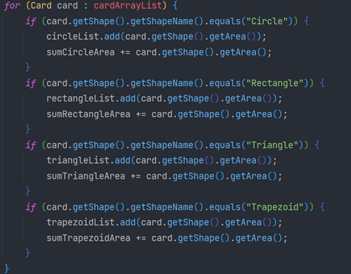 if (maxArea < sumCircleArea) { maxArea = sumCircleArea; } if (maxArea < sumRectangleArea) { maxArea = sumRectangleArea; } if (maxArea < sumTrapezoidArea) { maxArea = sumTrapezoidArea; } if (maxArea < sumTriangleArea) { maxArea = sumTriangleArea; } for (Card card : cardArrayList) { if (maxArea < card.getShape().getArea()) { maxArea = card.getShape().getArea(); } }