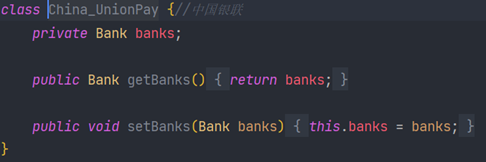 首先,中国银联肯定是可以说是可以操作任何东西的,所以在设计上我是将中国银联的地位默许成最高了。我是将中国银联里面放了银行,通过getter和setter方法来获取设置银行,然后通过银行来操作后续的业务等等。