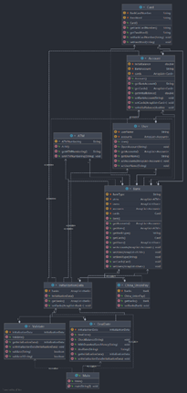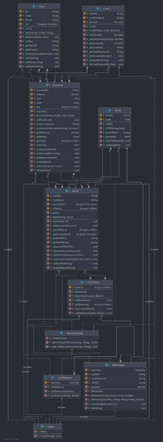 银行是拥有自己的ATM机的,并且拥有所以的账户,卡,以及自己的用户的,用户可以知道自己在哪家银行开户,一个账户拥有多张卡,每张卡有自己的卡号。而我们在进行操作时就可以通过银行来判断自己十分拥有这个用户,用户获取自己的账户,账户再来获取账户里面的卡,这样子就实现了各种信息的对应与获取,同时也算是比较符合现实生活。同时我创建了一个InitialData类来初始化所有的数据,同时创建了一个DealDate类来进行各种业务的操作,最终的设计类图也就是大概这样子吧,